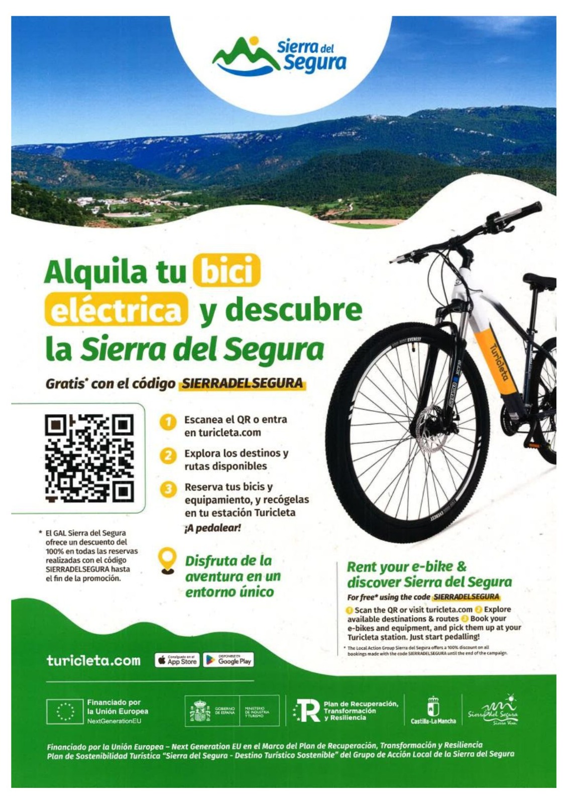 El Grupo de Acción Local Sierra del Segura junto con los 12 ayuntamientos de la comarca, ha puesto en marcha el nuevo servicio de alquiler de bicicletas eléctricas, a través del “Plan de Sostenibilidad Turística Sierra del Segura: Destino Turístico Sostenible”, que está disponible en nuestro municipio, y que será GRATIS HASTA 15 DE ENERO DE 2026, para ello, solo tienes que introducir el código promocional: SIERRADELSEGURA cuando hagas la reserva de(...)