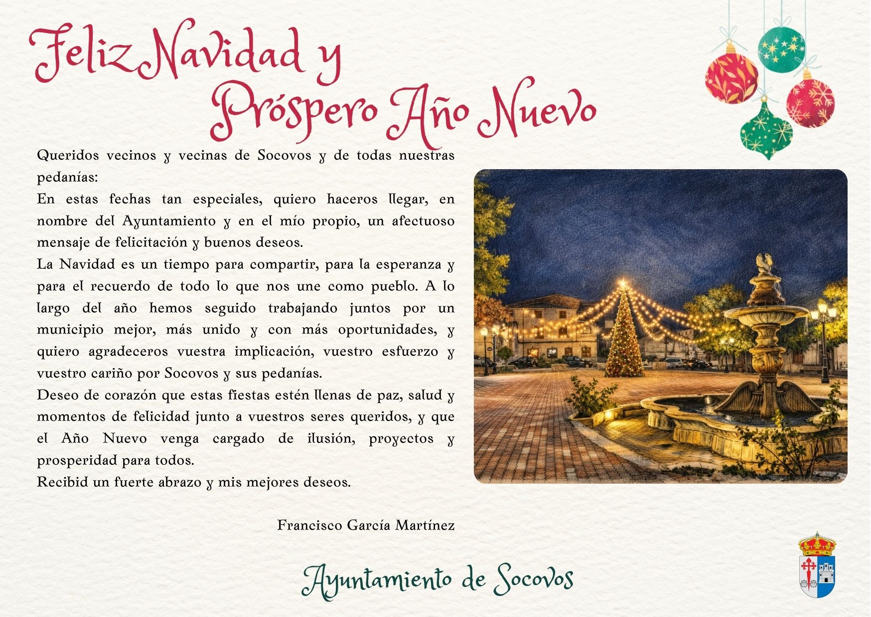 En estas fechas tan especiales, quiero enviar un afectuoso mensaje de Navidad a todos los vecinos y vecinas de Socovos y de nuestras pedanías Tazona, Los Olmos, Cañada Buendía y El Cañar.
