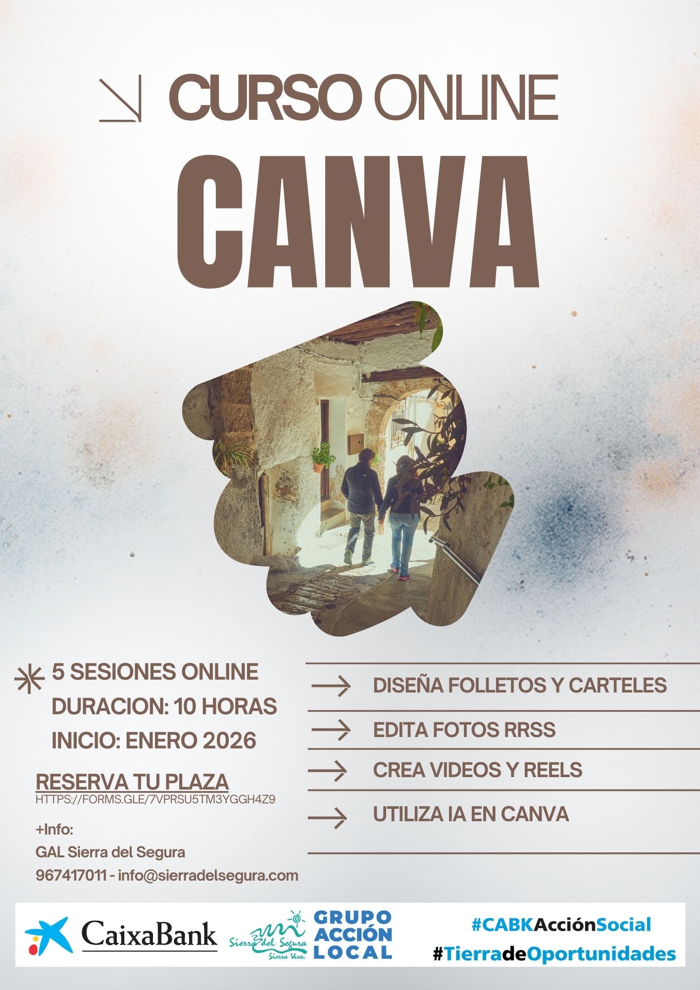 Desde el Grupo de Acción Local Sierra del Segura te animamos a participar en la formación "Curso Online Canva" para emprendedores, un programa práctico pensado para ayudar a mejorar la comunicación digital de los negocios rurales.