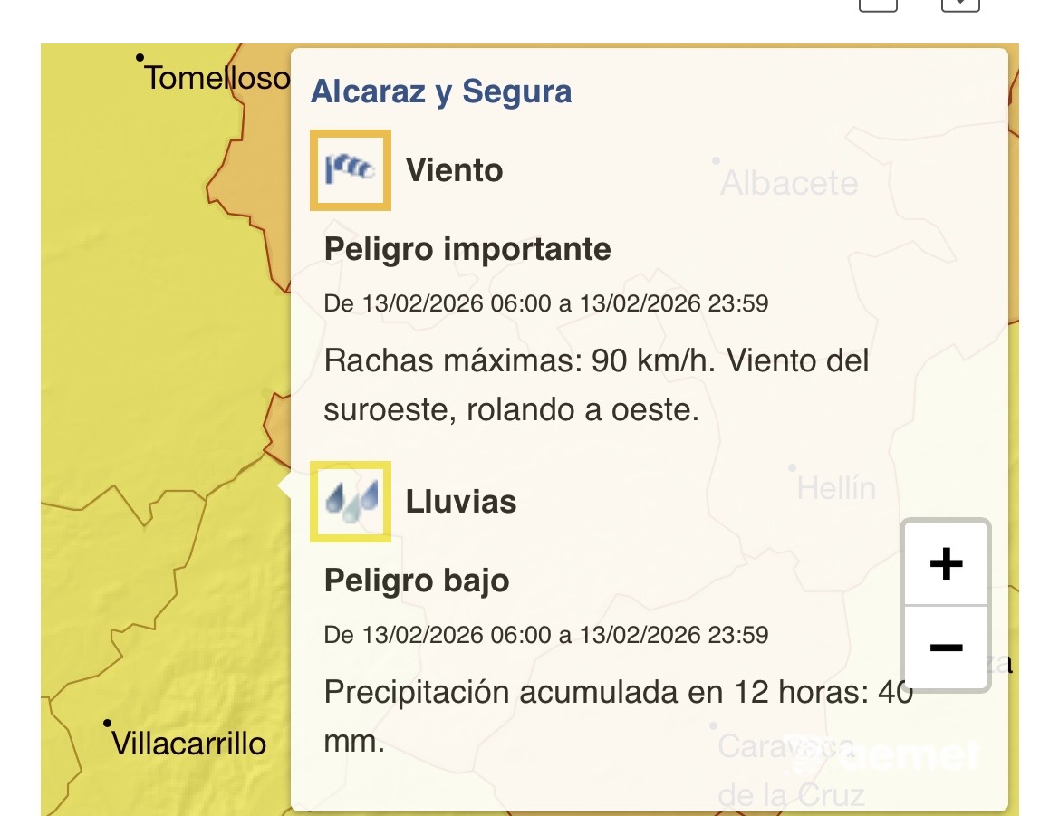 27/01/2026. AEMET informa aviso meteorologico nivel Naranja por vientos de 90 km/h, en Albacete (toda la provincia). Inicio 06:00 horas del 28/01/2026. Fin 20:00 horas del 28/01/2026. Emergencias 112